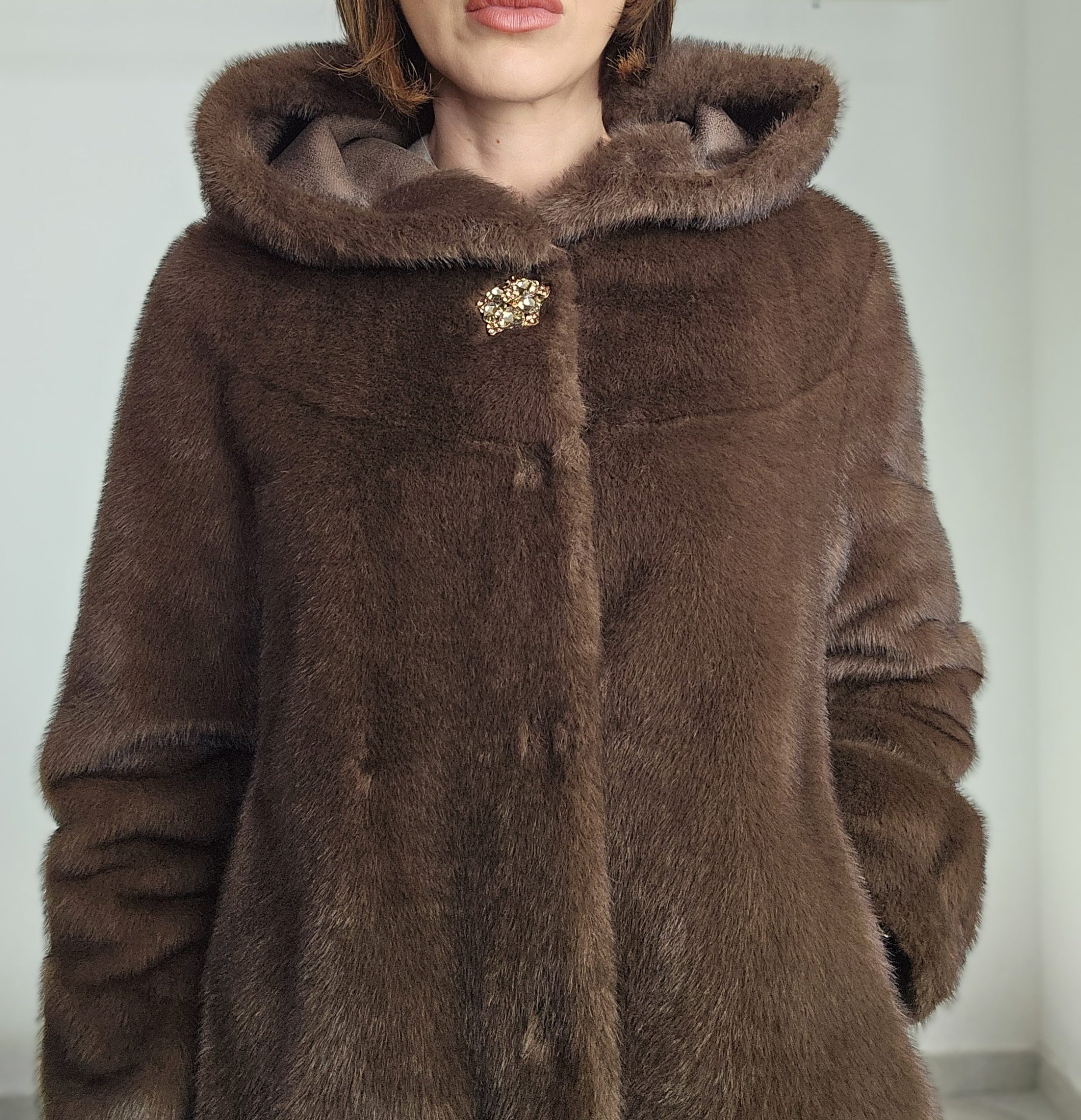 CHIUSURA CON BOTTONI A PRESSIONE E A SCOMPARSA. BOTTONE GIOIELLO AL COLLO. TASCHE LATERALI.